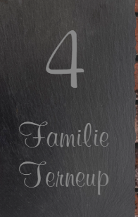 De tekst/ huisnummer wordt in het leisteen naamplaat gelaserd.