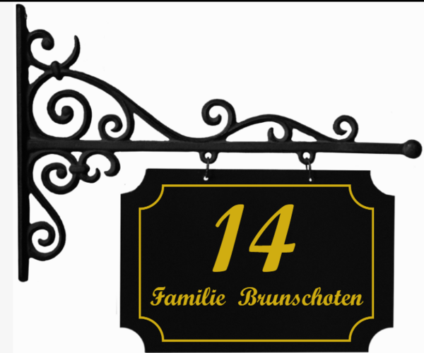 Uithangbord van gietijzer met een onderbord van 30 cm breed en 20 cm hoog. Het uithangbord heeft een klassieke vorm met uitgespaarde hoeken. Deze reeks uithangborden zijn geschikt voor de voordeur van elke woning en winkel. Aan beide zijden worden alle uithangborden bedrukt.