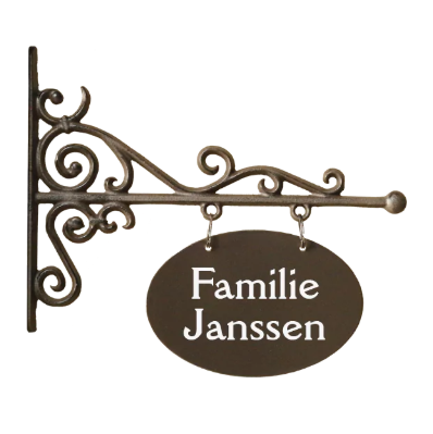 Uithangbord voor uw voordeur heeft een onderbord van 18,5× 12 cm. Het uithangbord heeft een ovale vorm. Deze reeks uithangborden zijn geschikt voor de voordeur van elke woning en bedrijf. Aan beide zijden worden alle uithangborden bedrukt.