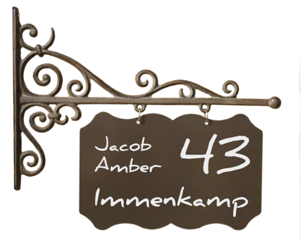 Uithangbord voor uw voordeur heeft een onderbord van 31 cm breed en 20 cm hoog. Het uithangbord heeft een klassieke vorm met uitgespaarde hoekjes aan de onderkant. Deze reeks uithangborden zijn geschikt voor de voordeur van elke woning en winkel. Aan beide zijden worden alle uithangborden bedrukt.