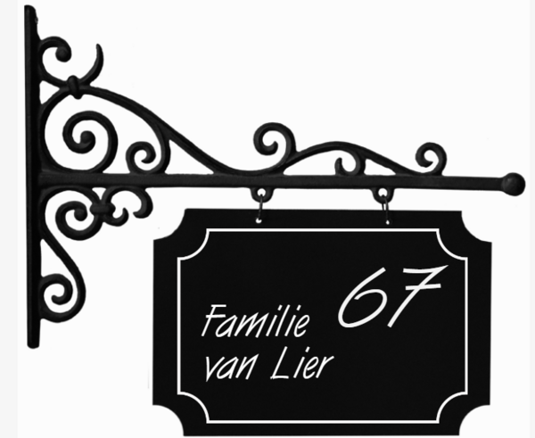 Uithangbord van gietijzer met een onderbord van 30 cm breed en 20 cm hoog. Het uithangbord heeft een klassieke vorm met uitgespaarde hoeken. Deze reeks uithangborden zijn geschikt voor de voordeur van elke woning en winkel. Aan beide zijden worden alle uithangborden bedrukt.