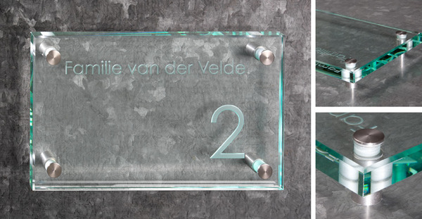 Extra dik naambord 1,5 cm.Tekst is gezandstraald maar u kunt ook een eigen kleur kiezen. Uw tekst op het glazen naambord zijn verschillende lettertypes voor.